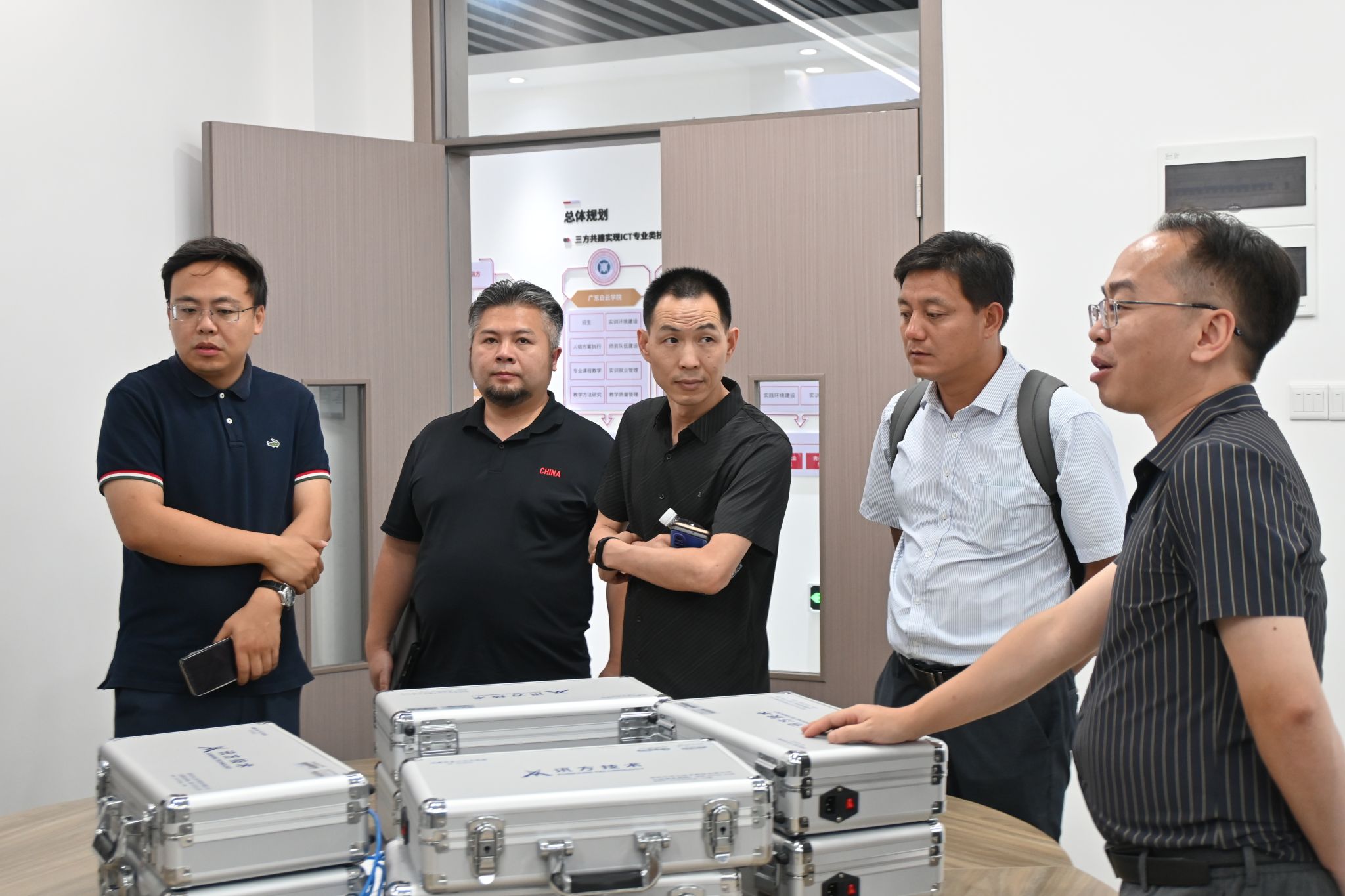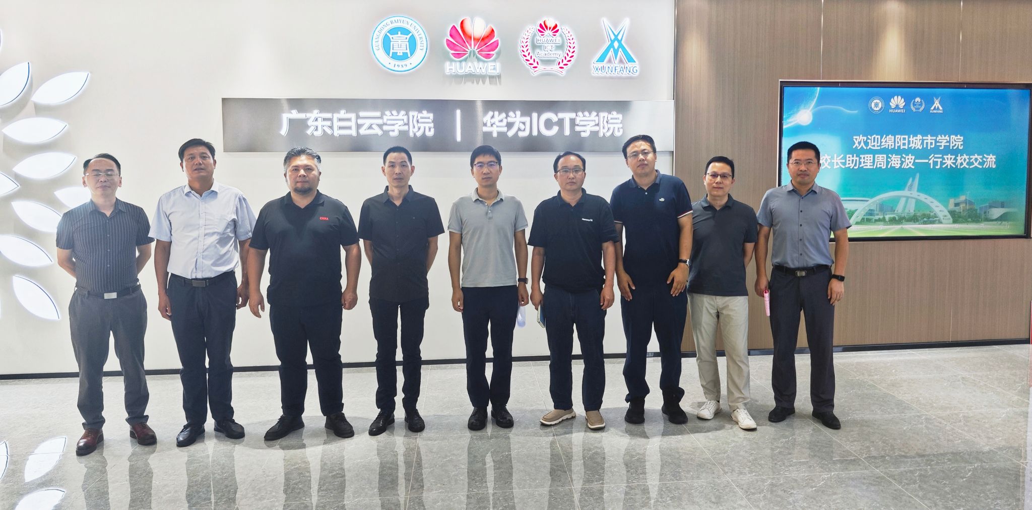 6月13日,绵阳城市学院校长助理、教务处处长周海波,现代技术学院副院长(主持工作)王梓龙,专业集群主任黄振华,计科教研室主任邓强一行莅临广东白云学院华为ICT学院考察交流。广东白云学院电气与信息工程学院副院长兼华为ICT学院副院长张永棠,华为ICT学院物联网工程专业主任关成斌、通信专业主任方烨、就业班主任黄小芳,以及讯方技术西南区四川市场经理陈铁柱、广白云运营中心运营经理王新磊共同接待。