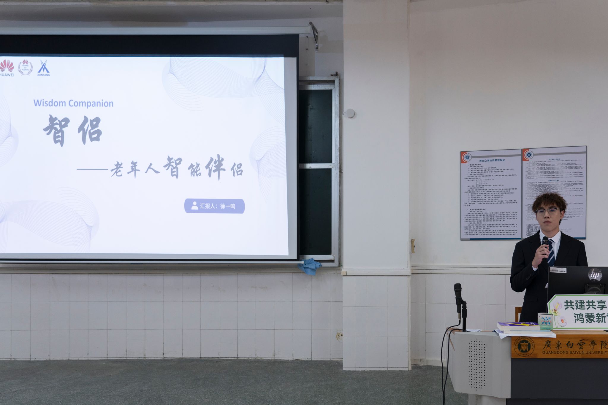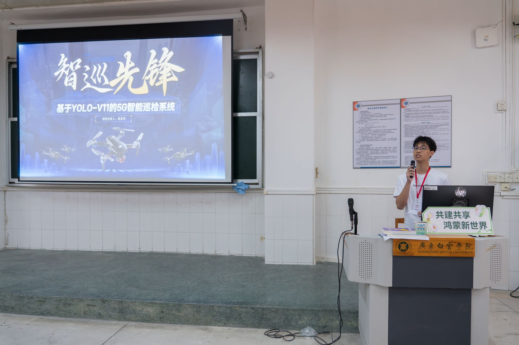 随后进入学生项目展示环节,白泽队四位项目负责人简要分享:邓繁的“智学领航”整合校园功能并获赛事奖项;徐一鸣的“智能伴侣”聚焦老年人健康监测;汤俊杰的“小白云”已落地校园服务;梁本洋的“智巡先锋”提升巡检效率,所有项目均扎根真实需求,展现了学生的实践能力与创新思维。