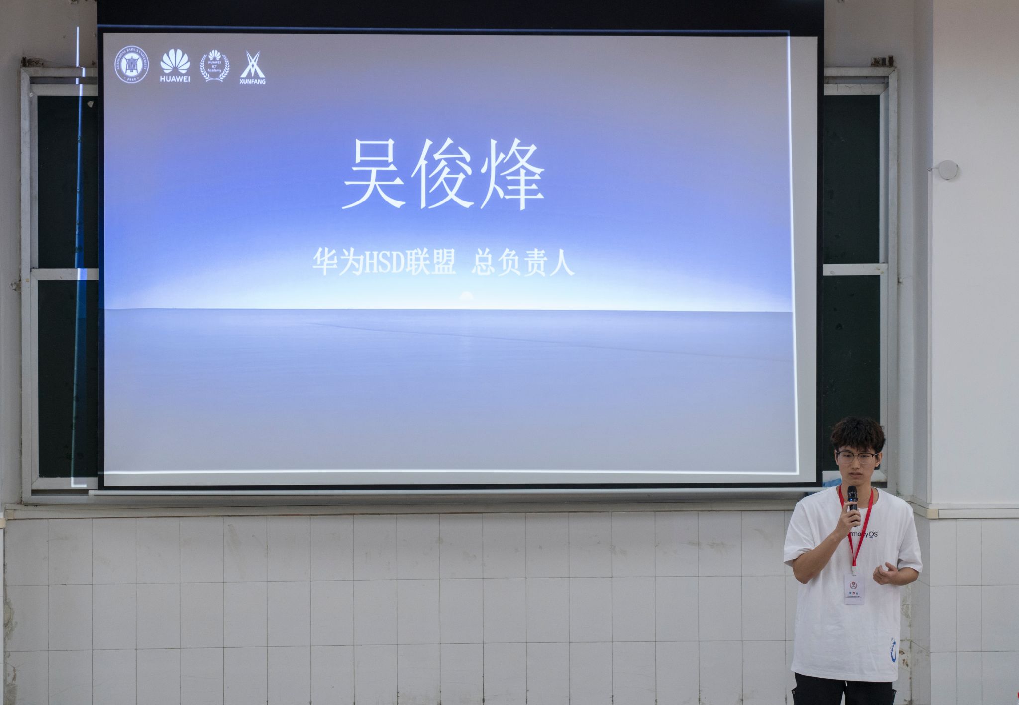 接下来,华为HSD联盟总负责人吴俊烽在致辞中鼓励同学们积极参与鸿蒙生态及联盟项目。他结合自身创建白泽队并发展为HSD联盟的经历,强调持续学习与团队成长的重要性,并寄语同学们“因联盟相聚,但不限于联盟”,期待大家在技术合作之外也能建立深厚友谊。最后,他以“我与旧事归于尽,来年依旧迎花开”勉励同学们把握当下、展望未来。