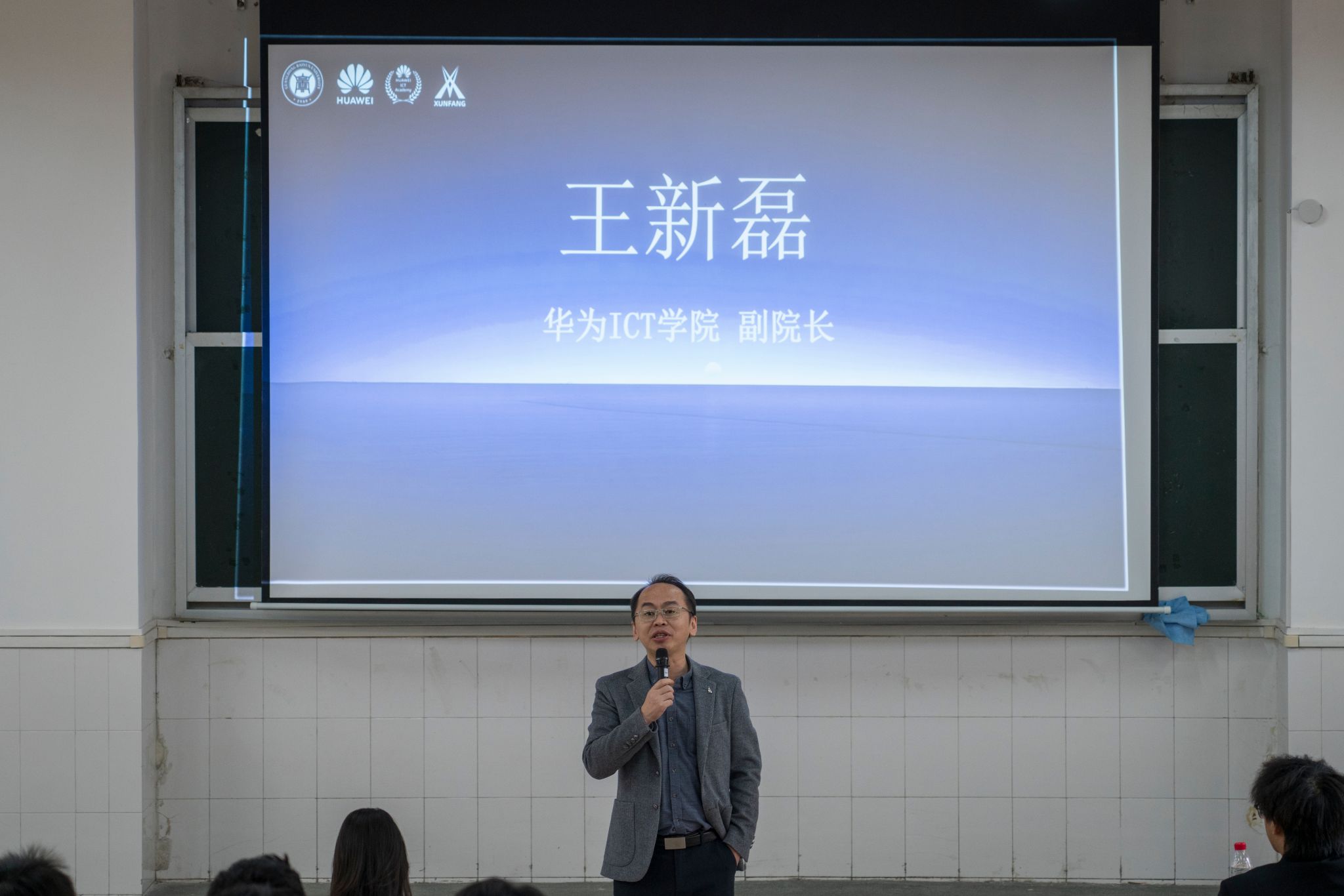 活动开场后,嘉宾代表依次上台分享,为在场师生传递技术理念与实践经验。讯方技术广白云运营中心经理、广东白云学院华为ICT学院副院长王新磊首先发言,以亲切幽默的语气开场,用贴近学生生活的鲜活例子迅速调动起全场氛围,赢得台下阵阵掌声。他在发言中着重强调实践对人才培养的重要性,鼓励同学们打破课堂学习的局限,主动利用学院创新实验室、华为学习平台、行业导师等优质资源,将专业理论与实际应用结合。他还倡导大家聚焦市场需求,大胆探索并落地具备商业潜力与社会价值的实践项目,在实战中提升专业能力与创新思维,为未来职业发展和行业贡献夯实基础。