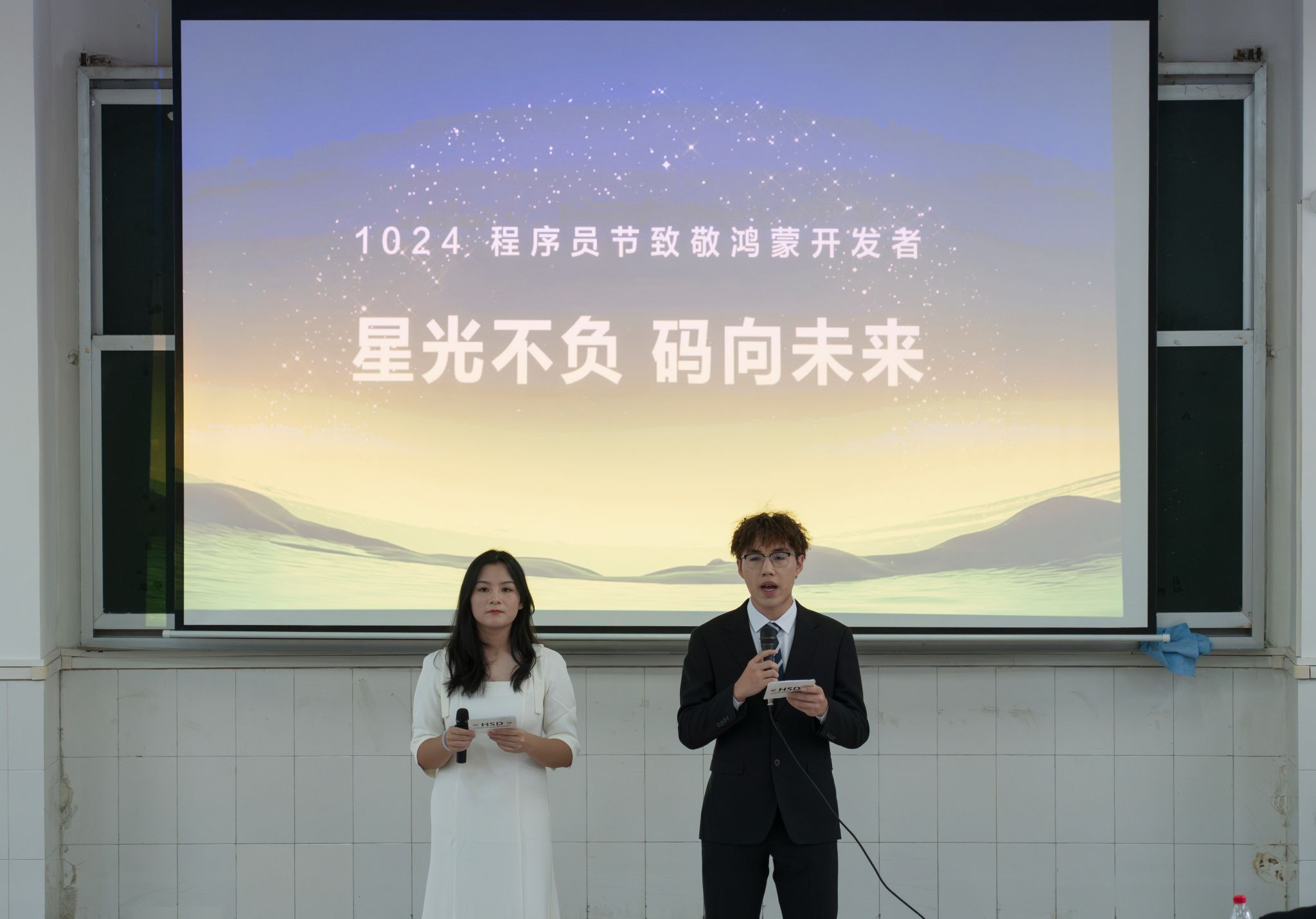 10月23日,由华为开发者联盟HUAWEI Student Developers(HSD)与广东白云学院华为ICT学院联合开展的“1024程序员节”在学校西校区成功举办。本次活动以“代码筑梦・技术赋能”为核心主题,特设“致敬鸿蒙开发者——星光不负,码向未来”专题展区,采用“知识工作坊+项目展示交流会”的形式开展。华为ICT学院教师、讯方技术驻校企业导师及华为鸿蒙开发者李佑铭等嘉宾受邀出席,华为公司为活动提供了全面的技术与物料支持。现场由徐一鸣、黄依雯两位同学主持,数百名师生共同参与,打造了一场沉浸式、高质感的技术交流体验。