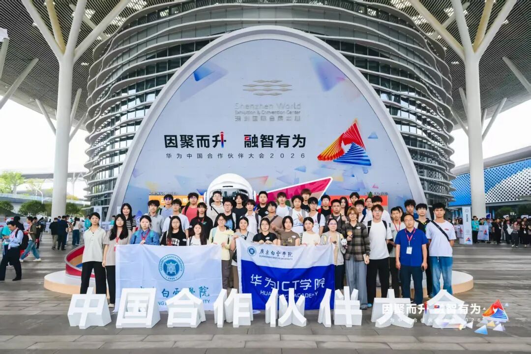 为深化校企协同育人、推动产教深度融合,2026 年 3 月 20 日,广东白云学院华为 ICT 学院组织学生代表赴深圳国际会展中心,参加华为中国合作伙伴大会 2026 研学实践活动。本次活动由华为 ICT 学院副院长张永棠、计算机科学与技术专业主任陈小文,以及校企就业导师陈诗莹、劳莉华等多位老师带队,学院 24 级、25 级学生代表共同参与,师生共计 82 人。
