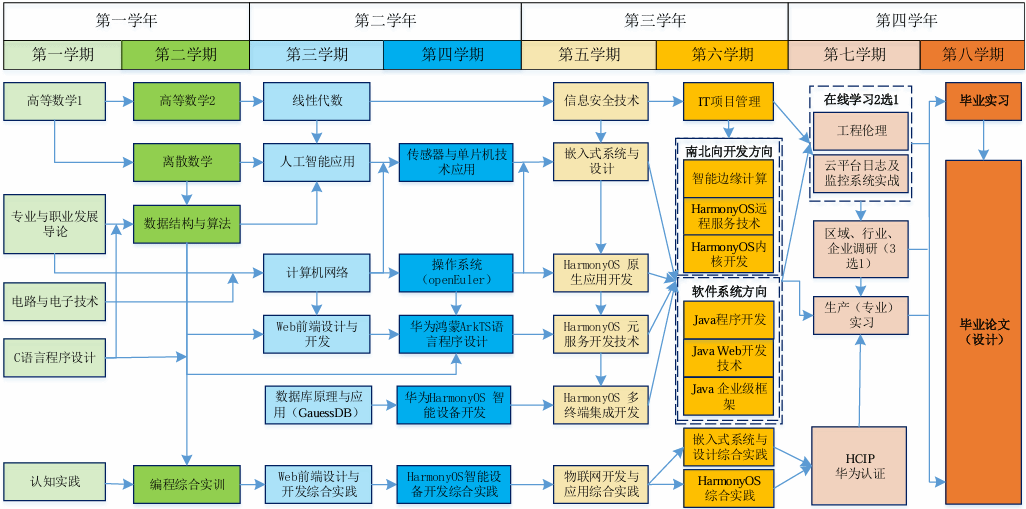本专业核心课程设置面向培养兼具工程实践能力、产业系统思维、人工智能素养人才为目标,打造“广博基础+鸿蒙生态+华为认证+工程实战”的课程体系。